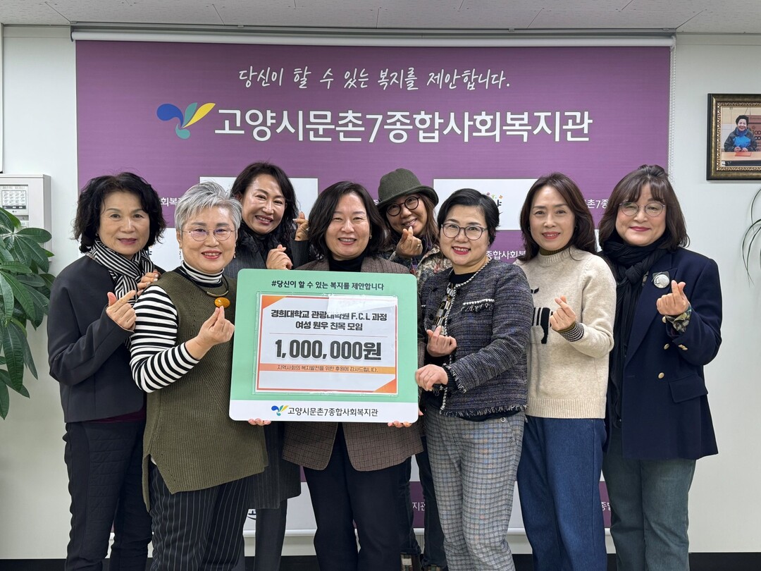[부자동네타임즈 = 김인수 기자] 경희대학교 관광대학원 퍼스트클래스리더(FCL) 과정 여성 원우 친목모임이 지난 30일 고양시문촌7종합사회복지관을 방문해 저소득 취약계층 지원을 위한 후원금 100만 원을 전달했다.