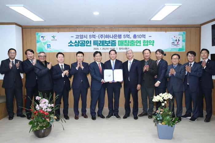이재준 고양시장, 강성묵 하나은행 총괄부행장, 이민우 경기신용보증재단 이사장은 지난 29일 상하수도사업소 창의소통실에서 협약식을 개최해 5만 4천여 곳에 이르는 고양지역 소상공인들을 위한 ‘2020년도 소상공인 특례보증’의 시작을 알렸다.
