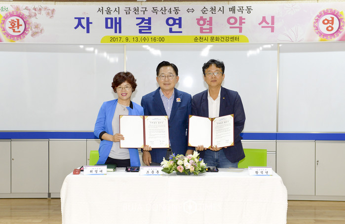 [부자동네타임즈 손권일 기자]순천시 매곡동과 서울시 금천구 독산4동이 13일 순천시 문화건강센터에서 상호발전을 위한 자매결연을 체결하고 상생발전을 약속했다.