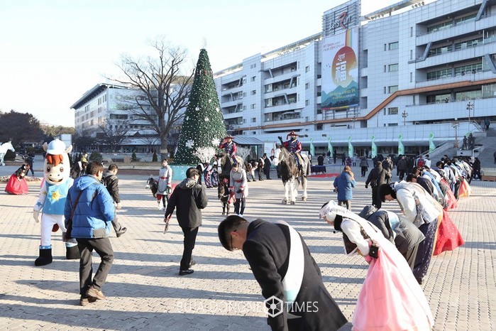 [부자동네타임즈 신동현 기자]마사회가 6일(토) 2018년 서울경마 첫 시행일을 기념하여 인기 기수와 조교사가 렛츠런파크 서울 중문광장에서 고객에게 백설기와 쌍화차 등을 나눠주는 사은행사를 시행했다. 특히 이날 행사에는 2017년 ‘최우수 조교사’와 ‘공정대상’, ‘베스트인기상’ 등 3관왕을 휩쓴 송문길(46) 조교사가 등장해 큰 인기를 끌었다.
