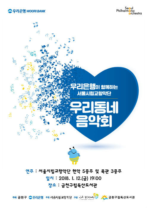 ‘우리동네 음악회’는 금천문화재단과 우리은행, 금천구가 주최하고 서울시립교향악단이 주관하는 공연으로 보다 많은 시민들에게 문화향유의 기회를 제공하고 클래식 공연 대중화를 위해 기획된 서울시립교향악단의 대표적 공익 공연이다.