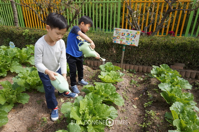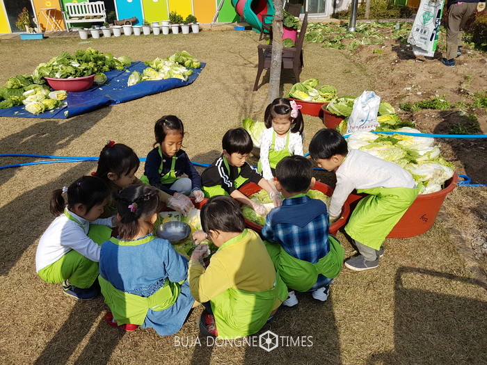 유아들이 지난 늦여름 유치원 텃밭에 심었던 가을 배추 모종 120여 포기에 물을 주고 가꾸어 무공해로 자란 배추를 수확하고 다듬어 씻고, 소금으로 절인 배추로 김치를 담그는 전 과정에 유아와 교사가 함께 참여했다.