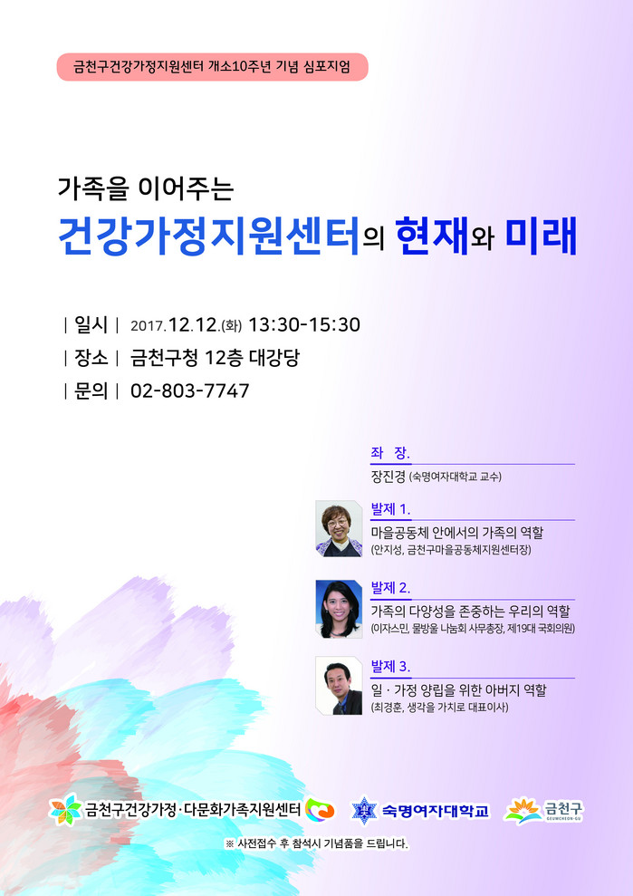 [부자동네타임즈 이병도 기자]금천구(구청장 차성수)가 금천구건강가정지원센터(센터장 전종미) 10주년을 맞아 ‘가족을 이어주는 건강가정지원센터의 현재와 미래’를 주제로 기념식 및 심포지엄을 12월 12일(화) 오후 1시 30분 구청 12층 대강당에서 개최한다고 밝혔다.