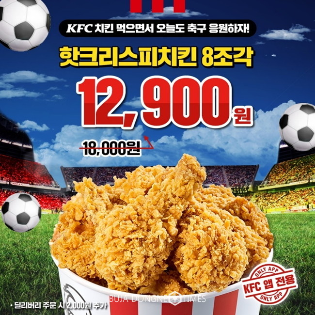 KFC 관계자는 “주요 스포츠 경기가 있는 날마다 응원과 함께하기 좋은 먹거리로 치킨을 찾는 고객들이 늘고 있어 이번에도 특별 할인 행사를 마련했다”며 “이번 경기는 오후 8시에 시작되므로, 퇴근길에 KFC 공식앱의 징거벨오더 또는 딜리버리로 치킨버켓을 구매 후 집에서 편안하게 축구 관람을 즐기시길 바란다”고 말했다.