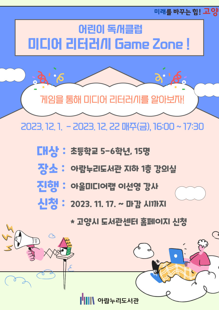 [부자동네타임즈 = 김인수 기자] 아람누리도서관은 12월 1일(금)부터 22일(금)까지 초등 5~6학년을 대상으로 ‘매체 이해력(미디어 리터러시) 게임 존’을 운영한다.