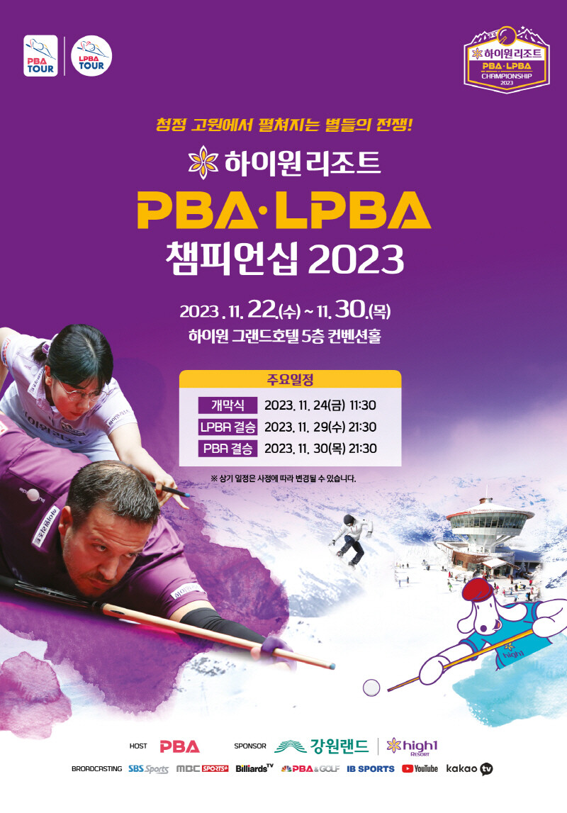 [부자동네타임즈 = 김인수 기자] 프로당구협회(PBA·총재 김영수)는 오는 22일부터 30일까지 9일간 강원도 정선군 하이원 그랜드호텔 컨벤션타워 컨벤션홀에서 ‘하이원리조트 PBA-LPBA 챔피언십 2023’을 개최한다고 밝혔다.