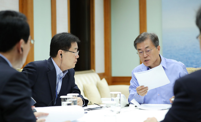문재인 대통령이 1일 밤 청와대 관저 소회의실에서 도널드 트럼프 미국 대통령과 통화를 앞두고 정의용 국가안보실장과 논의하고 있다. 2017.09.01. (사진=청와대 제공)