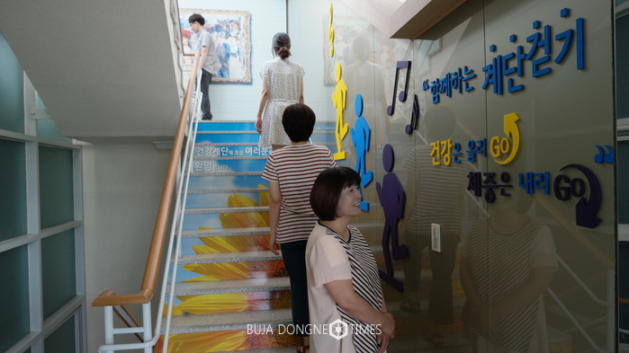 [논산=부자동네타임즈 이현석 기자] 논산시는 생활 속 신체활동을 유도하기 위해 보건소 지하부터 4층까지 건강계단을 조성해 눈길을 끌고 있다.