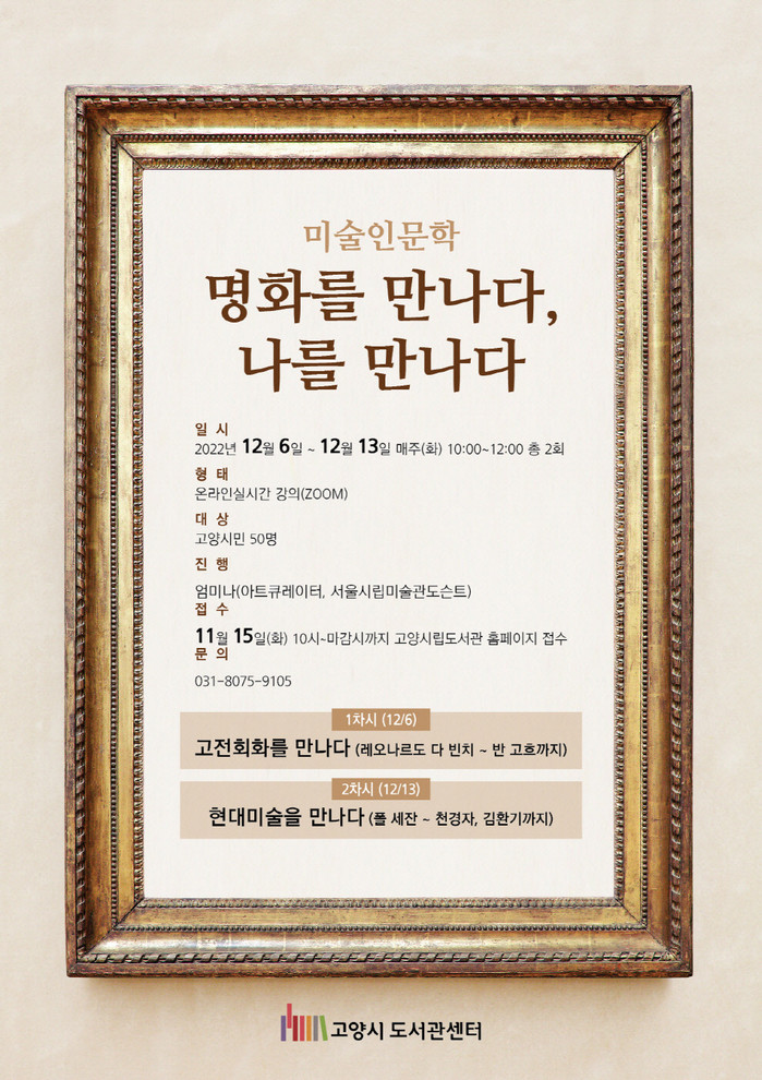 [부자동네타임즈 김인수기자] 고양특례시(시장 이동환) 한뫼도서관이 오는 12월 미술인문학 프로그램 명화를 만나다, 나를 만나다를 온라인으로 운영한다. 12월 6일부터 13일까지 매주 화요일 오전 10시~12시에 진행되는 이 프로그램은 미술에 관심이 있는 시민이라면 누구나 참여할 수 있다.