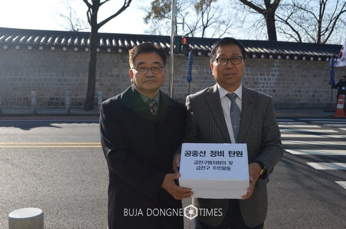 [부자동네타임즈 이병도 기자]서울시 금천구(구청장 차성수)의 민관협력기구인 금천구협치회의 위원과 주민들이 11월 27일(월) 오전 11시에 청와대를 방문해 저층주거지 생활환경을 심각하게 저해하고 있는 공중선 정비를 촉구하는 탄원서와 함께 주민 4,722명의 서명부를 제출했다.