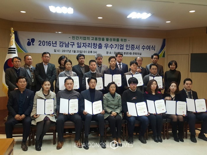 [부자동네타임즈 이병도 기자]강남구(구청장 신연희)는 오는 29일 지난 한 해 동안 일자리 20만 여개 창출에 기여한 관내 13개 우수 중소기업을 선정하고‘일자리 창출 우수기업 인증서’를 수여해 격려한다고 28일 밝혔다.