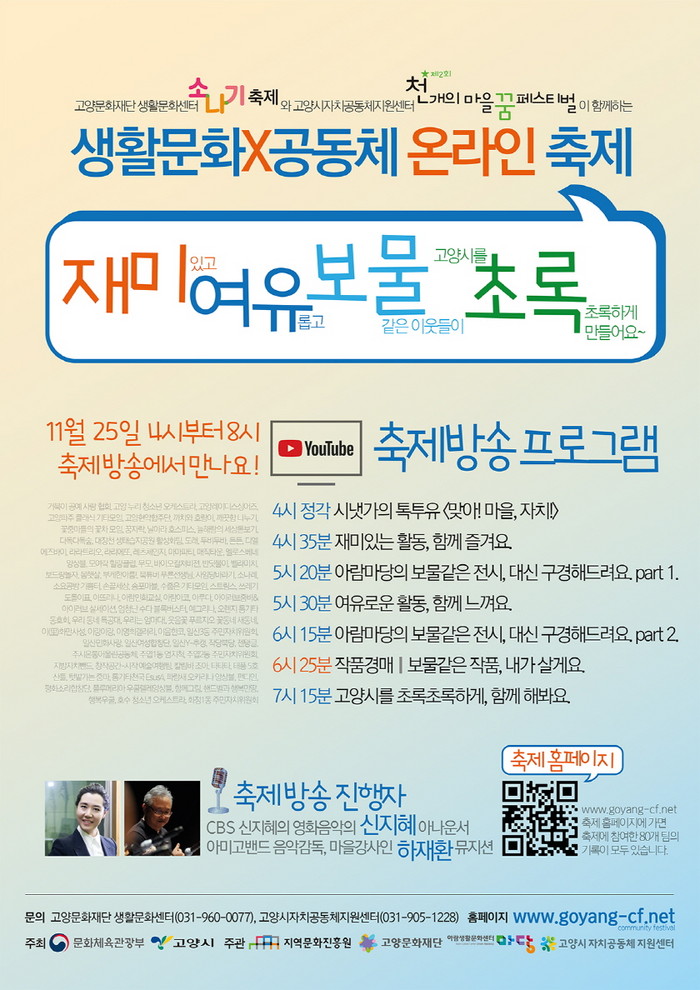 25일 오후 4시부터 8시까지 유튜브로 펼쳐지는 이번 축제는 CBS 신지혜 아나운서와 고양시 마을강사 하재환 뮤지션이 공동으로 진행을 맡는다. 특히 동호회 발표 영상 제공 뿐만 아니라 마을포럼 및 생활문화경매도 실시해 시민들과 실시간으로 상호 소통하는 시간을 갖는다.