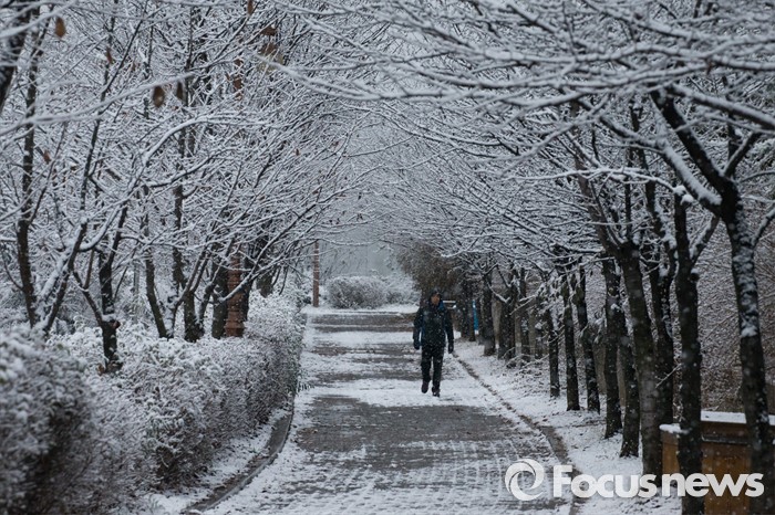 (서울=포커스뉴스) 전국에 눈이 내리는 3일 오전 서울 서초구 반포대로에서 시민이 눈을 맞으며 이동하고 있다.