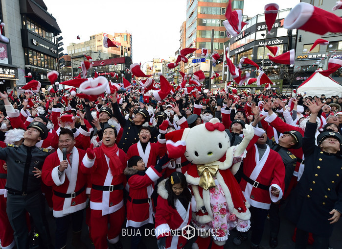 [부자동네타임즈 이병도 기자]2018 신촌 크리스마스 거리축제’ 사흘째인 24일 오후 신촌 연세로에서 ‘사랑의 몰래산타 대작전’ 출정식이 열린 가운데 산타 복장을 한 문석진 서대문구청장(앞줄 왼쪽 세 번째)과 자원봉사자들이 산타 모자를 하늘 높이 던지고 있다. 이 축제는 성탄절에도 오후 1시부터 8시까지 열린다.