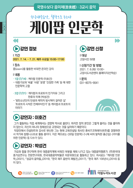 [부자동네타임즈 김인수기자] 고양시 아람누리도서관은 코로나로 인해 지친 시민들의 마음에 활력을 불어넣기 위해 대중음악을 주제로 하는 ‘케이팝 인문학’을 7월 14일부터 진행한다.