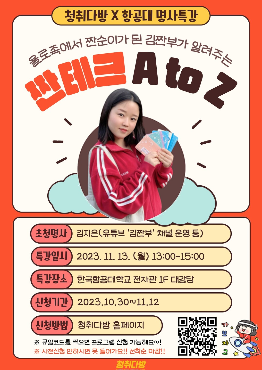 [부자동네타임즈 = 김인수 기자] 오는 13일 오후 1시에 한국항공대학교 전자관 1층 대강당에서 재테크 분야 인기 유튜버 ‘김짠부’를 초청해 특강 ‘짠테크 에이 투 제트(A to Z)’를 개최한다.