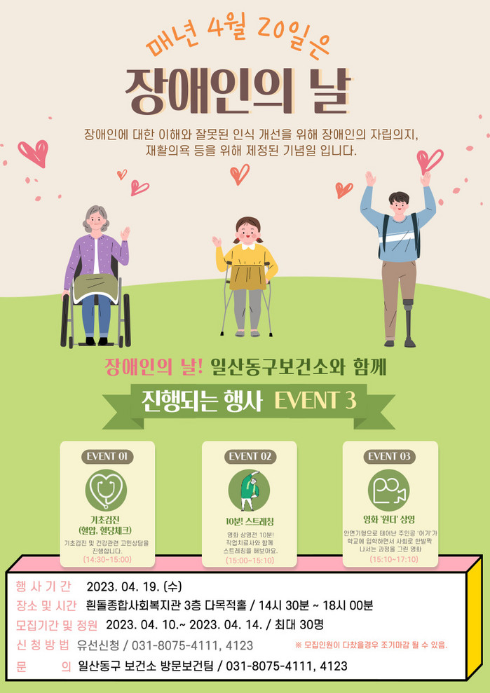 행사 날에는 ▲기초검진(혈압, 혈당 측정) ▲간단한 스트레칭 ▲영화 ‘원더’ 상영 ▲보건소 지역사회중심재활사업 홍보 등이 진행될 예정이다.