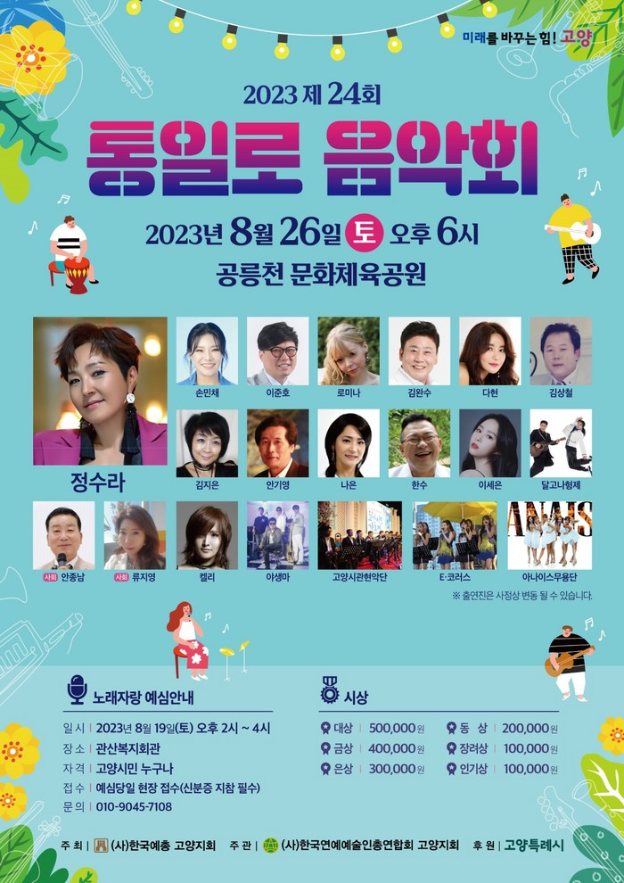 [부자동네타임즈 김인수기자] 고양특례시가 후원하고, (사)한국예술문화단체총연합회 고양지회가 주최, (사)한국연예예술인협회 고양지회에서 주관하는 ‘제24회 통일로 음악회’가 오는 8월 26일(토) 공릉천 문화체육공원에서 열린다.