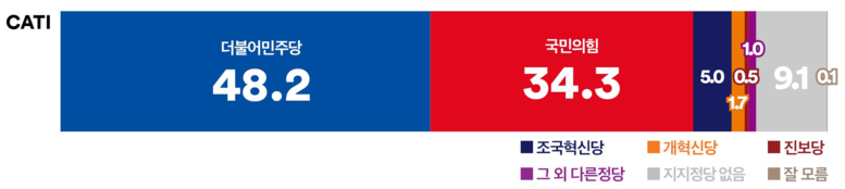 ‘여론조사꽃’정당지지도: 민주 48.2%(2.2%p↓) vs 국힘 34.3%(±0.0%p) vs 조국 5.0%(1.5%p↑)