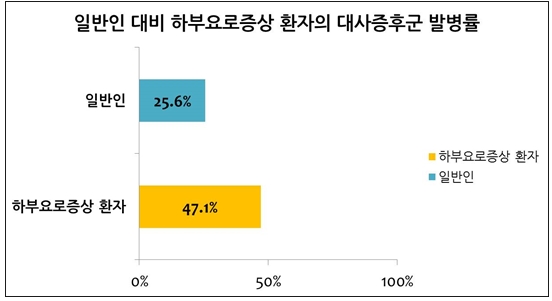 이는 국내 건강검진 수검자 대비 대사증후군 발병률인 25.6%에 비해 월등히 높은 수치다.