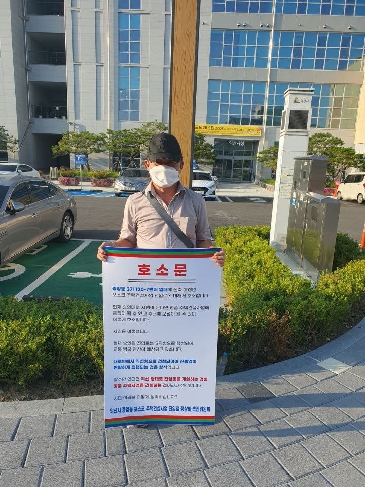 건설업체가 4차선 도로를 확보하기 위해 내놓은 ‘농협 건물 쪽 매입’ 진입로 확보 방안 때문이다. 만약에 농협 건물을 확보한다면 S자형 기형적 진입로로 교통 혼잡이 우려되는 상황에 반발하여 익산 시청 정문 1인 시위를 진행 중이다. 농협 관계자는 응답을 하지 않은 것으로 알려졌다.