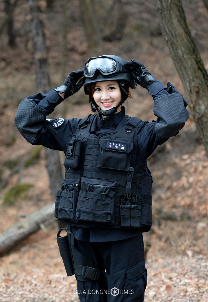 국방일보 '좌충우돌 병영체험'에 참가한 KBS 장주희 기상캐스터가 10일 서울 관악구 수도방위사령부 헌병단에서 흑복을 입고 포즈를 취하고 있다. 2017.01.15. (사진=국방일보 제공)