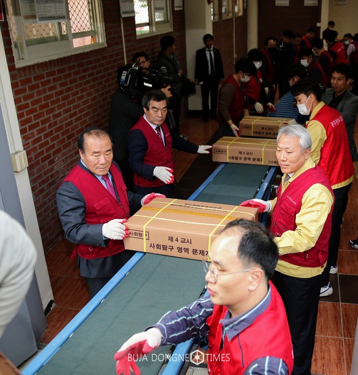 | △2018학년도 수학능력시험 문답지가 광주시교육청 원서접수처에 입고되었고 그를 직접 장휘국 교육감이 직접 분류 작업을 진행하고 있다 |