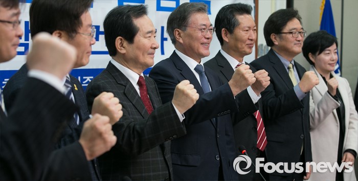 (서울=포커스뉴스) 문재인 새정치민주연합 대표 등 의원들과 관계자들이 9일 오전 서울 여의도 국회에서 열린 가계부채특위 출범식에 참석해 파이팅을 외치고 있다.