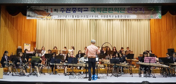 광주시 수완중학교(교장 김효중)가 11월 8일 수완중 늘품관(강당)에서 '제1회 수완중학교 국악관현악단 연주회'를 개최했다.