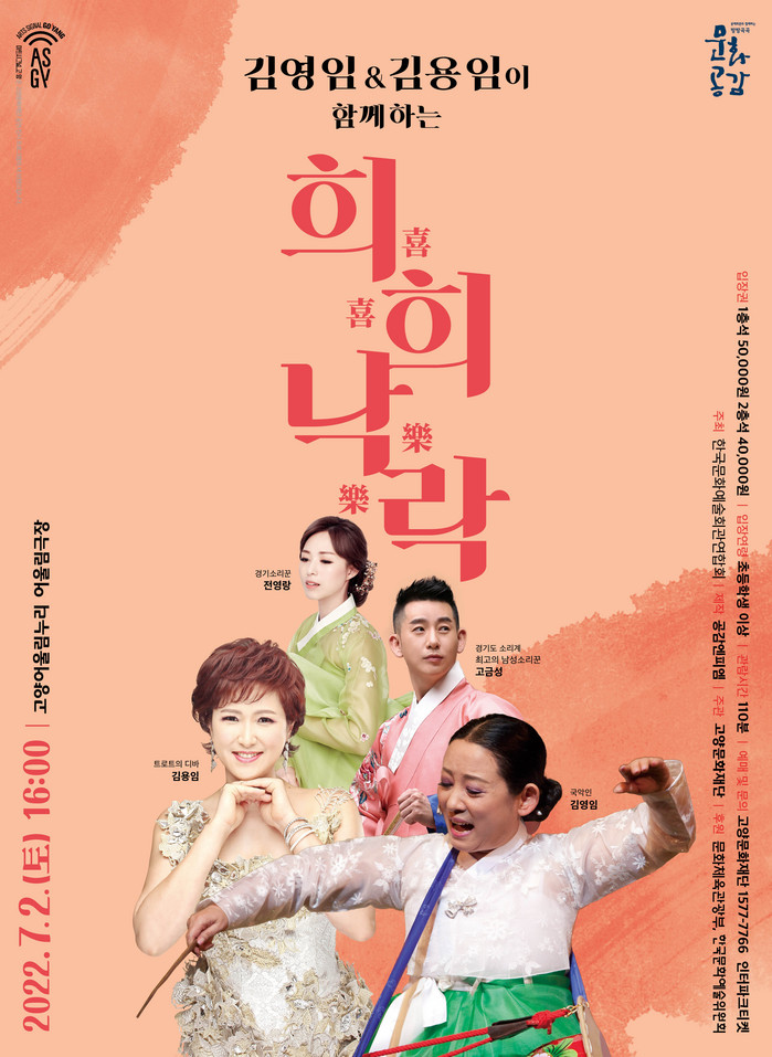 [부자동네타임즈 김인수기자] 고양문화재단(대표이사 정재왈)은 국악 명창 김영임과 트로트 여왕 김용임이 함께하는 ‘희희낙락 喜喜樂樂 ’콘서트를 오는 7월 2일 오후 4시 고양어울림누리 어울림극장에서 개최한다. 코로나19로 지친 중장년 관객을 위한 대중성 있는 콘텐츠로 시민들을 위해 마련된 무대이다.