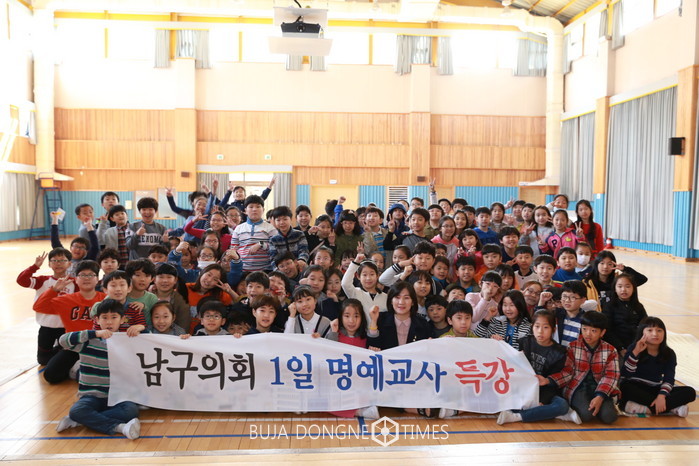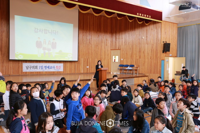 | △광주 남구의회 배진하 의원이 1일 명예교사로 나서 4일 명예교사로 나서 4일 오전 진제초등학교에서 특별수업을 실시했다 |