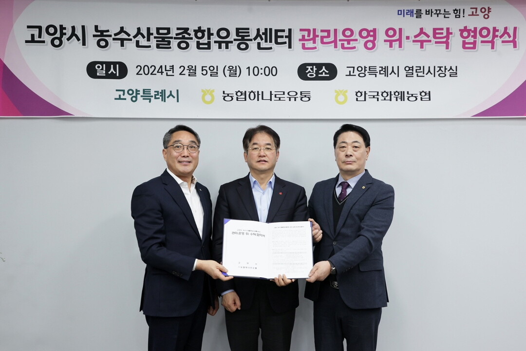 고양시 농수산물종합유통센터 관리운영 위·수탁 협약식은 시청 열린회의실에서 이동환 고양특례시장, 염기동 ㈜농협하나로유통 대표이사, 유석룡 한국화훼농협조합장, 관계자 등이 참석한 가운데 진행됐다.