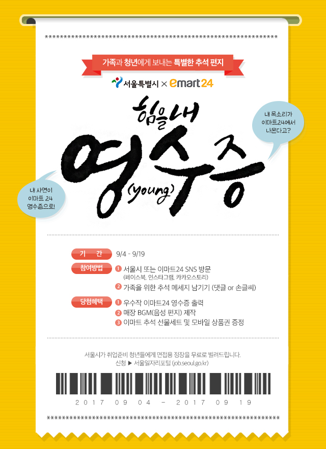 [부자동네타임즈 김현정 기자]이마트편의점‘이마트24’가 서울시와 함께 추석을 앞두고 가족에게 사랑의 메시지를보내는‘힘을 내,영(Young)수증’캠페인을 실시한다고 4일 밝혔다.