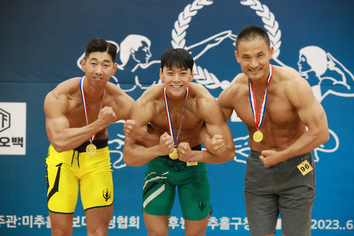 [사진설명] 제2회 인천광역시 미추홀구청장배 보디빌딩&피트니스 선발대회 남자 어슬래틱 피지크 175수상한 1위 부건호선수, 2위 권명회선수, 3위 이상국선수 수상 소감을 몸으로 표출하고 있다.