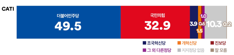 ‘여론조사꽃’정당지지도: ‘더불어민주당’ 49.5% 대 ‘국민의힘’ 32.9%, 양당 격차 16.6%p