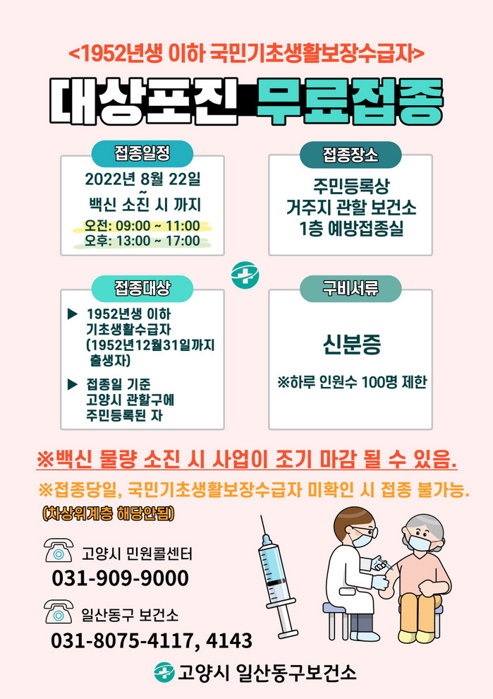 고양시 보건소는 8월 22일(월)부터 고양시 관내 주민등록주소지를 둔 만 70세 이상(1952년 12월 31일 이전 출생자) 기초생활수급자를 대상으로 무료 예방접종을 실시한다. 대상자는 신분증을 지참하여 등록주소지 관할 보건소를 방문하면 당일 접종 받을 수 있다.