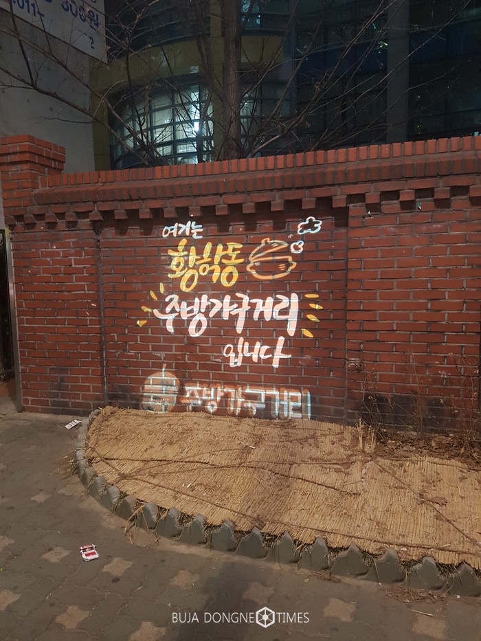 '여기는 황학동 주방가구거리입니다', '알뜰 쇼핑족의 필수코스' 등 주방가구거리임을 알리는 것부터 '오늘도 힘들었지? 수고했어', '힘내요 당신, 당신은 늘 최고니까요' 등 힐링 메시지를 담은 캘리그라피 불빛이 점포와 보도 위에 수놓여졌다.