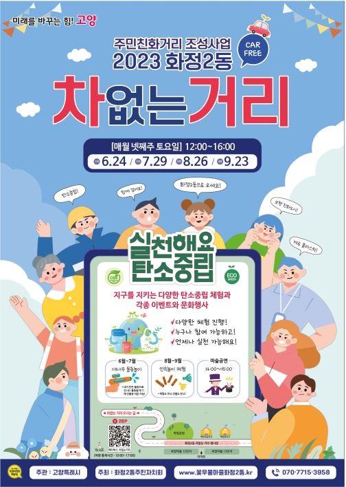 ‘차 없는 거리’는 온실가스 배출량을 낮추고 탄소중립에 기여하고자 차가 없는 거리를 지정하고 운영하는 환경 관련 행사이다. 9월까지 매월 넷째 주 토요일(12:00 ~ 16:00), 덕양구 백양초・중학교 앞 도로 350m (화정동 1114번지 일원) 구간에서 실시한다.