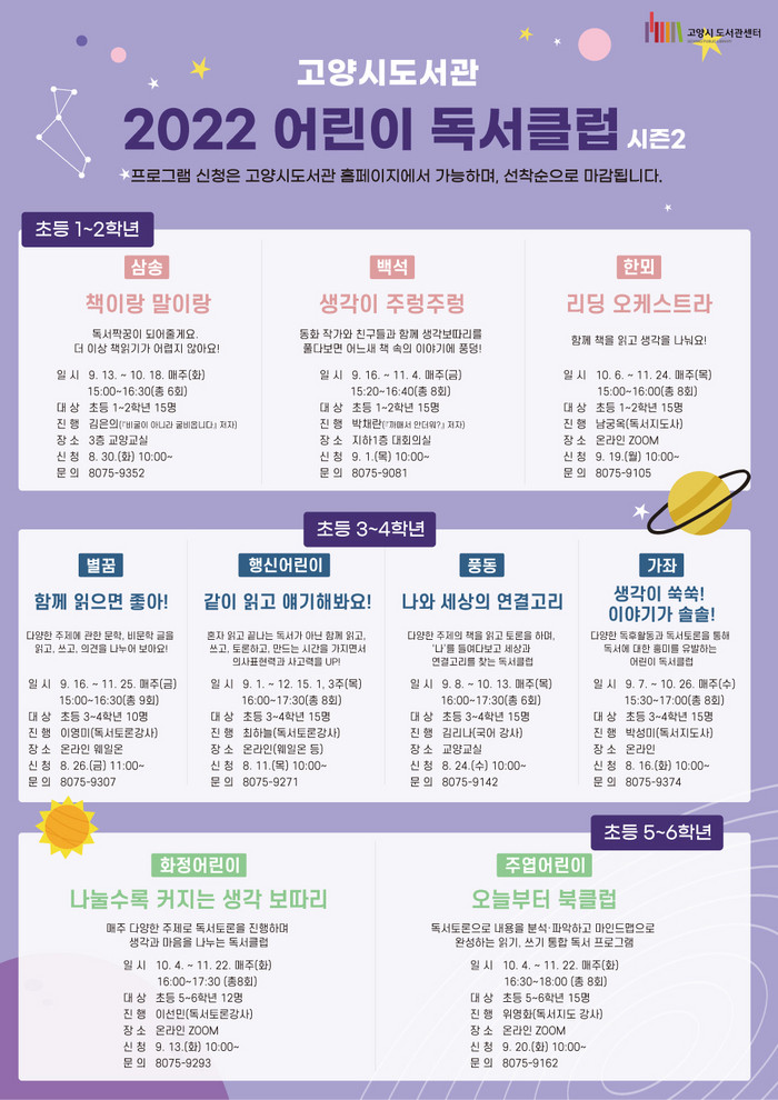 초등학교 5~6학년 대상 독서클럽은 ▲나눌수록 커지는 생각 보따리(화정어린이도서관) ▲오늘부터 북클럽(주엽어린이도서관) 등 2개가 운영된다. 고학년 대상 독서클럽은 심화된 주제로 이야기를 하며 논리적 사고를 기르는 시간으로 진행된다.