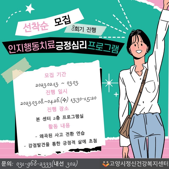 [부자동네타임즈 김인수기자] 고양특례시(시장 이동환) 정신건강복지센터 청춘나래팀에서 3월부터 만 19세 이상 ~ 34세 이하의 청년을 대상으로 ‘인지행동치료&긍정심리 프로그램’을 실시한다.
