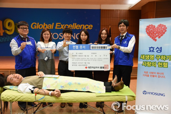 △ 효성이 대한적십자사와 함께 서울 마포 본사 지하1층 강당에서 ‘백혈병·소아암 어린이 환자를 위한 사랑의 헌혈 행사’를 개최하며 참석자들이 기념사진을 찍고 있다. <사진제공=포커스뉴스>