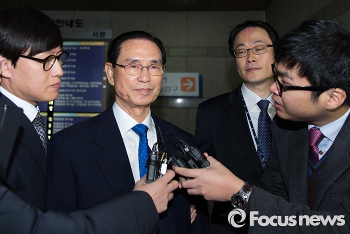 (서울=포커스뉴스) 30일 오전 서울 서초구 서울중앙지법에 금권선거와 불법 금품수수 등 의혹을 받고 있는 조남풍 재향군인회장이 피의자신분으로 출석하기 전 취재진의 질문을 듣고 있다.