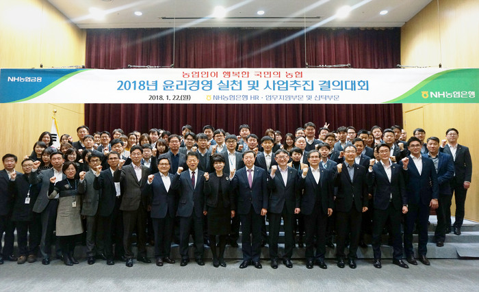 [부자동네타임즈 이현재 기자]NH농협은행(은행장 이대훈) HR·업무지원부문과 신탁부문은 22일 중구 통일로에 위치한 농협은행 본사에서 김연학 부행장 및 소속직원 100여명이 참석한 가운데 「2018년 윤리경영 실천 및 사업추진 결의대회」를 가졌다고 23일 밝혔다.