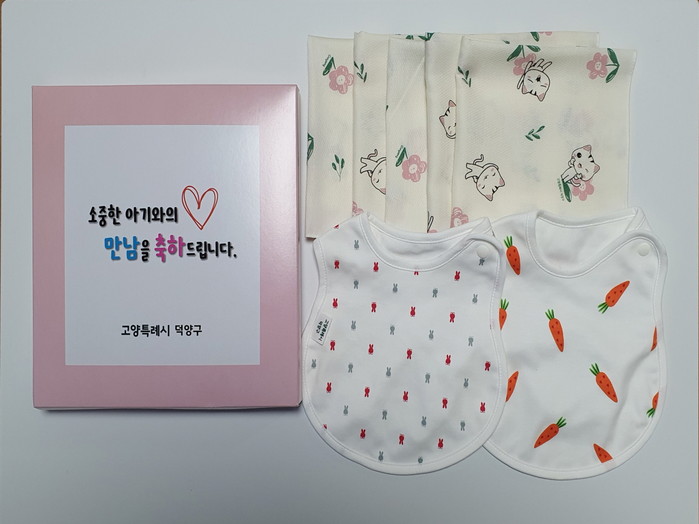 출생신고 시 축하 기념 홍보물(유기농 손수건·턱받이) 증정.