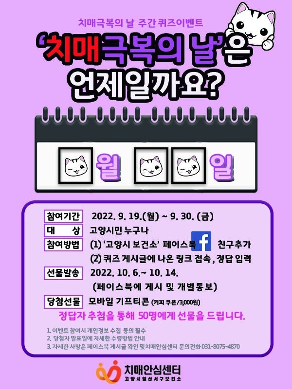 [부자동네타임즈 김인수기자] 고양특례시(시장 이동환) 일산서구보건소 치매안심센터가 치매극복의 날(9월 21일)을 맞이해 ‘치타(치매타파)’ 퀴즈 이벤트를 개최한다.
