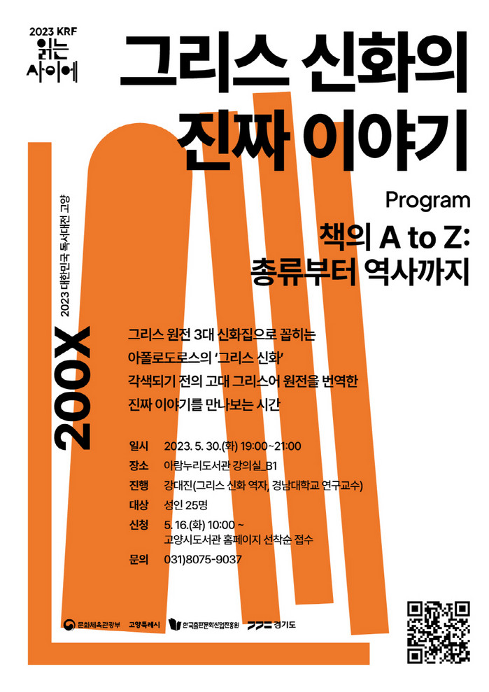 [부자동네타임즈 김인수기자] 아람누리도서관은 오는 5월 30일 저녁 7시 <책의 A to Z: 총류부터 역사까지> 세 번째 시간으로 그리스 신화의 진짜 이야기를 통해 강대진 교수와의 만남을 진행한다.