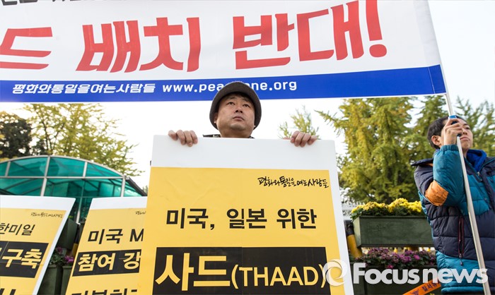(서울=포커스뉴스) 2일 오전 서울 용산구 국방부 앞에서 평화와통일을여는사람들이 제47차 한미연례안보협의회(SCM) 규탄 기자회견을 하고 있다.