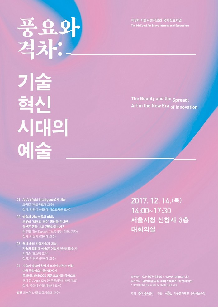 [부자동네타임즈 이병도 기자]서울문화재단(대표이사 주철환) 금천예술공장은 4차 산업혁명 시대에 예술의 미래에 관해 논의하는 <제9회 서울시창작공간 국제심포지엄>을 12월 14일(목) 오후 2시부터 5시 30분까지 서울시청 신청사 3층 대회의실에서 개최한다. 이번 심포지엄은 ‘풍요와 격차: 기술 혁신 시대의 예술’이라는 주제로 예술이 기술변화에 어떻게 대응해 왔으며, 앞으로 어떻게 대응해야 할지를 고민한다.