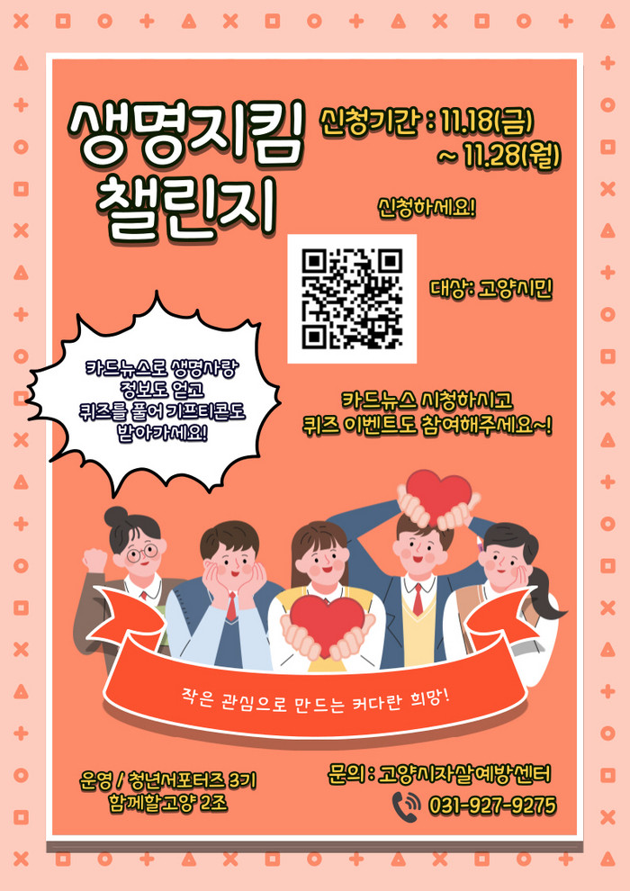 참여방법은 고양시자살예방센터 홈페이지와 인스타그램에 게시된 카드뉴스를 시청한 후 QR코드 접속을 통해 11월 28일까지 퀴즈 이벤트에 참여하면 된다. 챌린지는 평소 자살예방에 관심 있는 고양시 거주민이면 누구나 참여할 수 있다.
