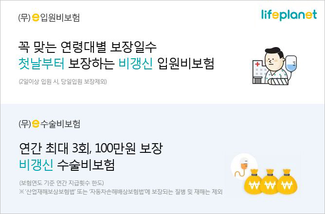 일반적으로 소비자들의 니즈가 큰 입원비와 수술비 보장은 주계약에 갱신형 특약형태로 부가되는 경우가 많아 갱신 시마다 보험료 인상에 대한 부담이 컸다. 그러나 이번에 출시된 라이프플래닛의 입원비ㆍ수술비보험 2종은 80세 만기 비갱신형으로 보험료 변동이 없어 큰 부담 없이 장기적인 위험에 대비할 수 있다. 또한 입원비와 수술비를 정액 보장함으로써 기존에 실손보험에 가입했더라도 중증질환 발생이나 입원치료 시 보다 든든하게 보장받을 수 있다.